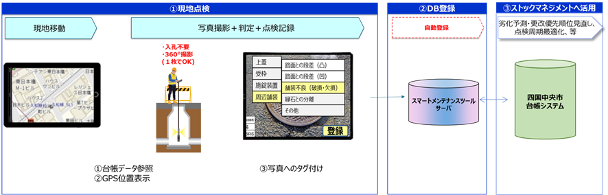 四国中央市では、下水道点検業務において、点検周期は異なるものの、管路点検を全数実施する計画を立てています。しかし、予算の都合上、全ての業務を委託することは困難であったため、日常のパトロールや苦情対応などの業務の中で、事前に台帳データを印刷の上、マンホールの点検を行っていました。点検の際は、各職員が施設の写真撮影を個別に行い、それぞれが写真のデータ保存をしていたため、点検自体は実施出来ていても、その記録を一元的に残すことが出来ていませんでした。帰庁後の写真整理にも稼働を要していました。