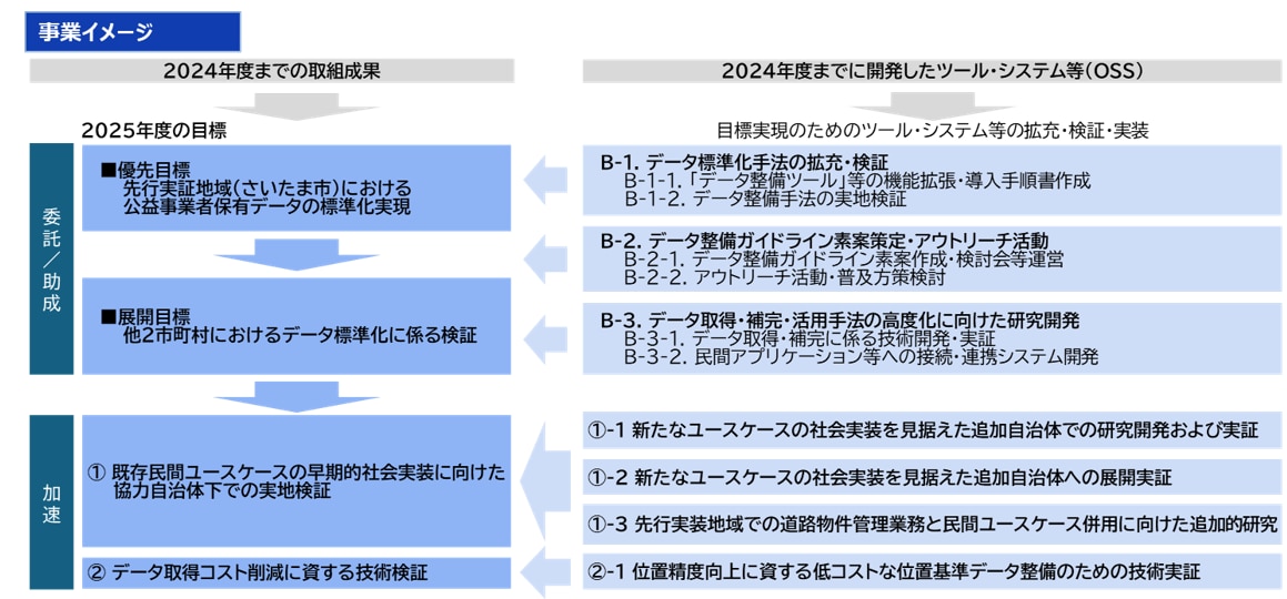 本事業ではこれらの課題解決に向け、公益事業者が保有するインフラ設備情報のデータ標準化とその普及を目指し、以下の研究開発項目に取り組みます。