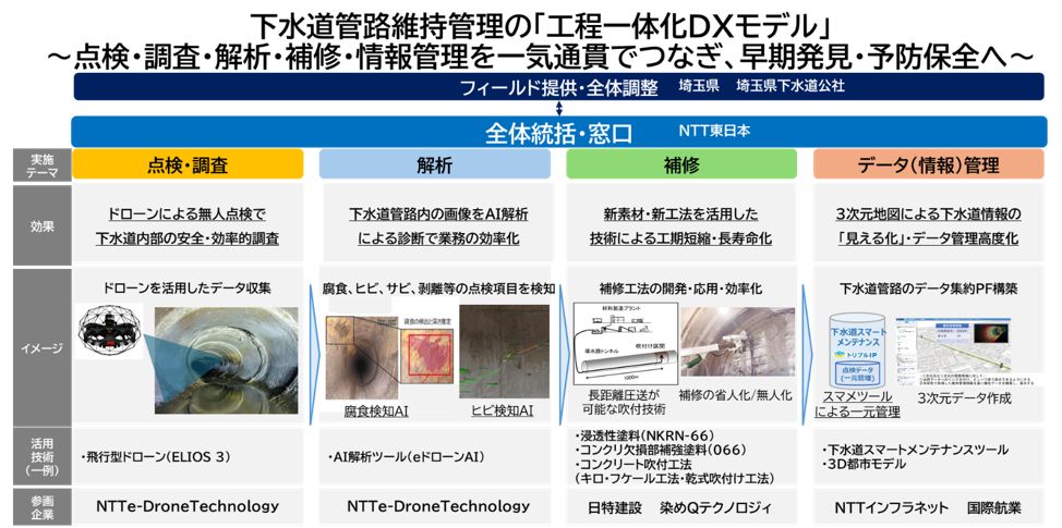 埼玉県・埼玉県下水道公社:実証フィールドとなる流域下水道管路選定/提供/実証計画や安全管理に関する調整/実証結果に基づく技術評価・有効性の判断 NTT東日本:研究全体の統括・調整/DXモデル設計/成果報告書作成 NTT e-Drone Technology:ドローンによる下水道管路内情報取得/劣化箇所を検知するAI解析の開発 NTTインフラネット:点検情報管理ツールの提供と情報連携による可視化 国際航業:下水道管路3D化・GIS等を用いた情報設計/見える化画面の検討 染めQテクノロジィ:特殊塗料による既設下水道管路の修復強靭化技術を用いた再生延命と短期施工/省人化・無人化補修プロセス検討 日特建設:長距離圧送が可能な吹付技術を用いた補修技術の高度化検討