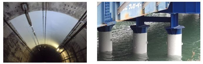 <トンネル内部の補強・塗布面> <橋脚(海・河川部)の補強施工部>