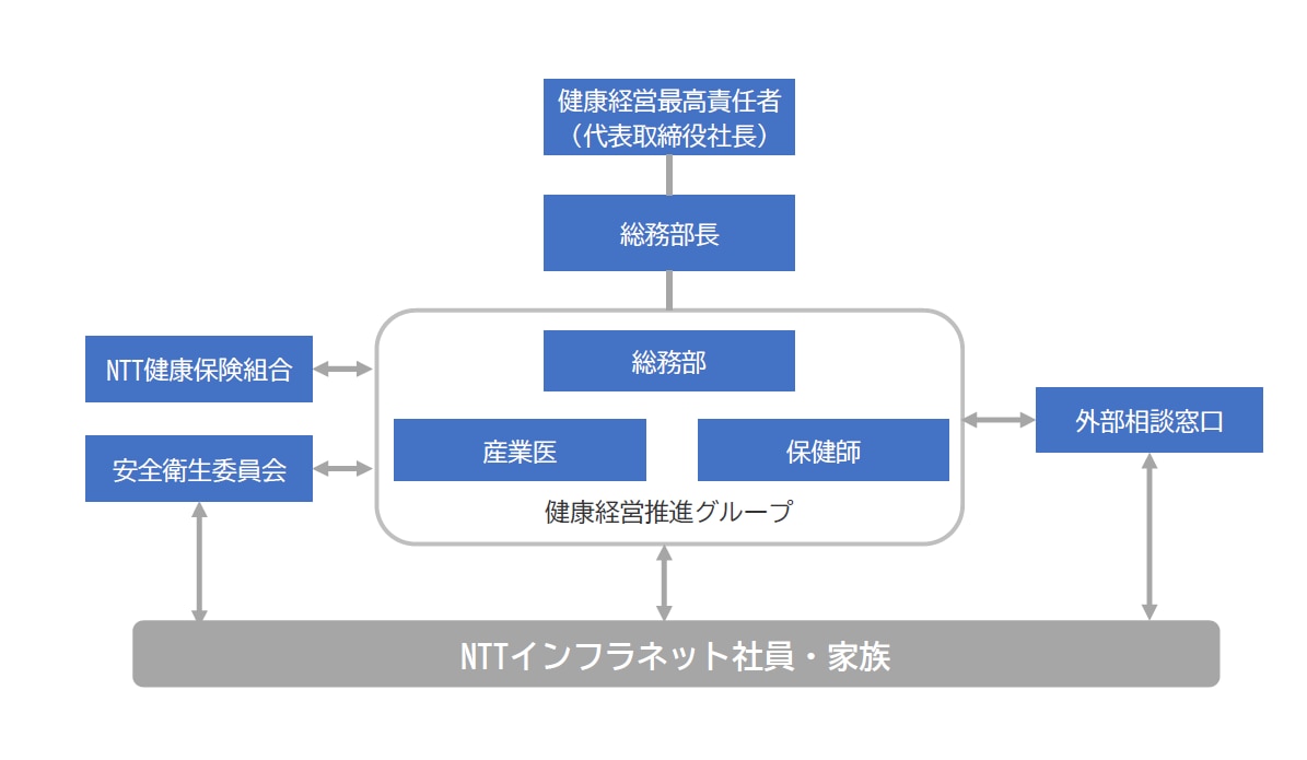 健康経営の最高責任者には代表取締役社長を据え、総務部長がその方針を統括しています。 実務面では総務部を中心とする「健康経営推進グループ」が中心となり、産業医や保健師、安 全衛生委員会、NTT健康保険組合、などと連携しながら、社員一人ひとりの心身の健康維持・ 増進に取り組んでいます。
