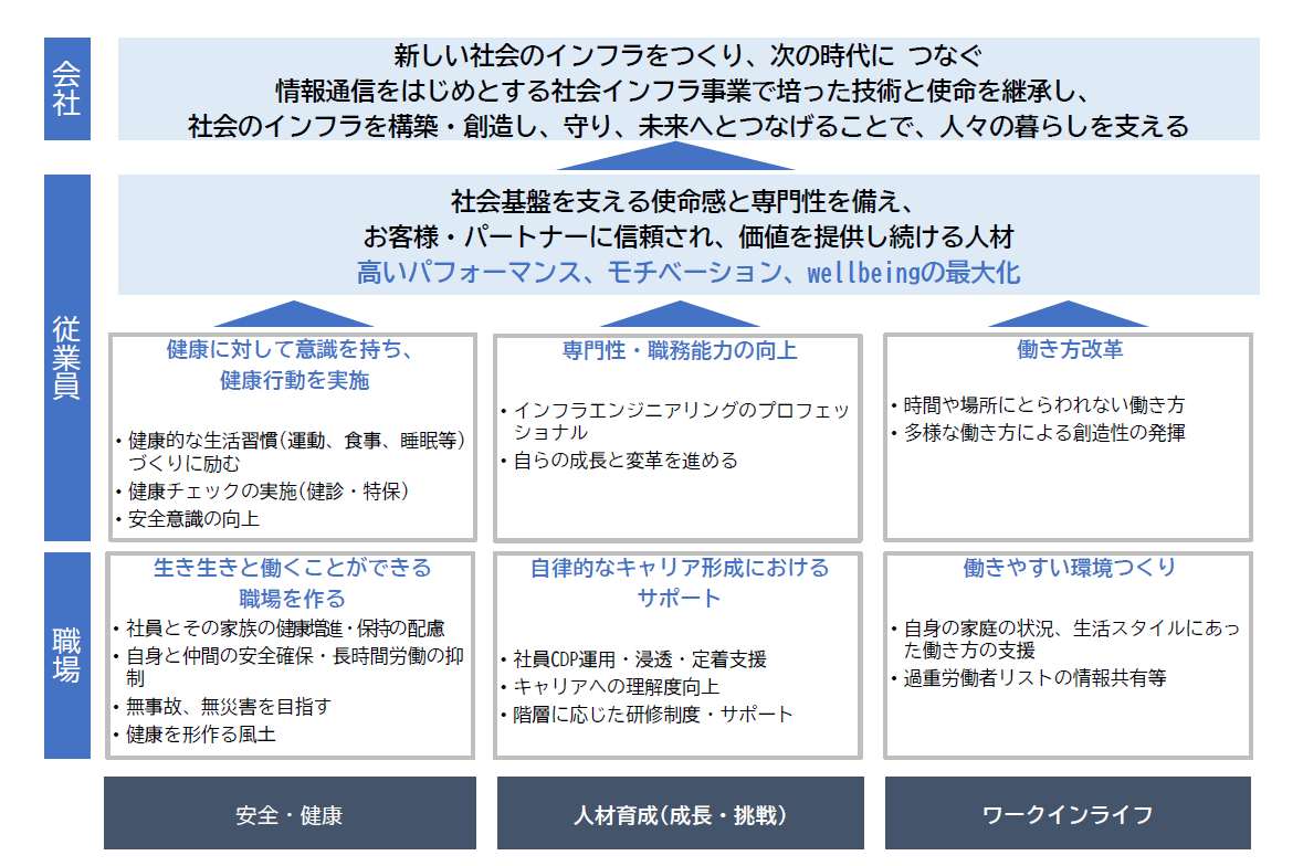 私たちNTTインフラネットは、情報通信をはじめとした社会インフラを構築・維持・発展させることで、人々の暮らしを支えるという重要な使命を担っています。この使命を果たし続け、次の時代へと確かに繋いでいくためには、私たち一人ひとりが心身ともに健康であり、 生き生きと働き続けられることが何よりも重要です。少子高齢化の進行、生活習慣病やメンタルヘルス不調の増加、働き方の多様化など、現代社会を取り巻く健康課題は複雑化・多様化しています。このような中、当社としては、社会基盤を支える使命感と専門性を備え、お客様・パートナーに信頼され、価値を提供し続けることが重要であり、そのためには、すべての社員が安心して長く働ける環境を整え、一人 ひとりが健康を意識し、行動し、互いを思いやれる職場づくりが必要です。